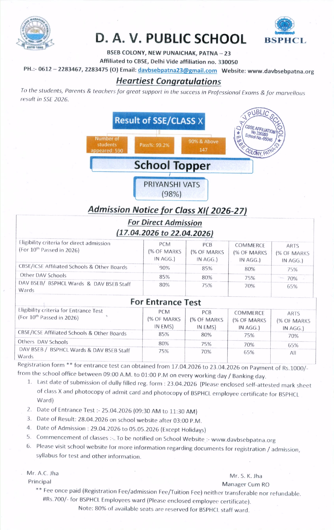 D.A.V. PUBLIC SCHOOL, BSEB PATNA BSEB COLONY, NEW PUNAICHAK, BIHAR - 800023 Phone : 0612 228 3467 Email : [email protected]