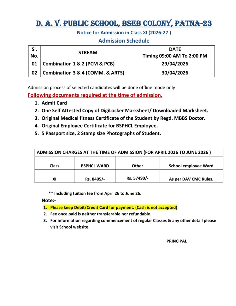DAV Public School, B.S.E.B Colony, New Punaichak, Patna is running upto +2 level (Science, Commerce & Arts) in collaboration with Bihar State Electricity Board